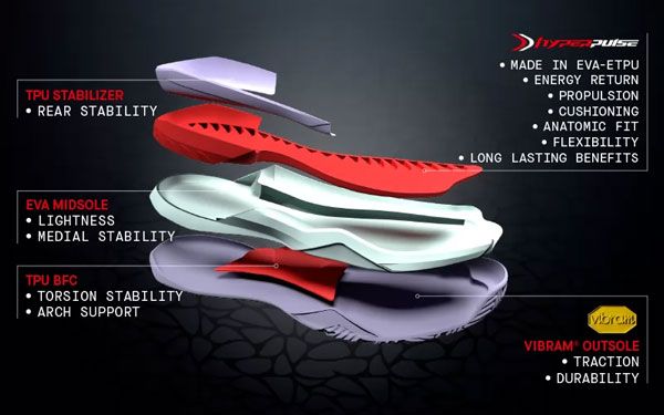 Podplat je popolnoma prenovljen z uvedbo novega Hyperpulse sistema. Inovativna nova tehnologija vmesnega podplata zagotavlja dodatno vračanje energije in dodatno blaženje. Poleg tega posebna oblika izboljša udobje in fleksibilnost.