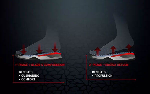 Ko pa se začne dvigati od tal, se vložki stisnejo in se ustvari učinek vzmeti, ki požene stopalo naprej.