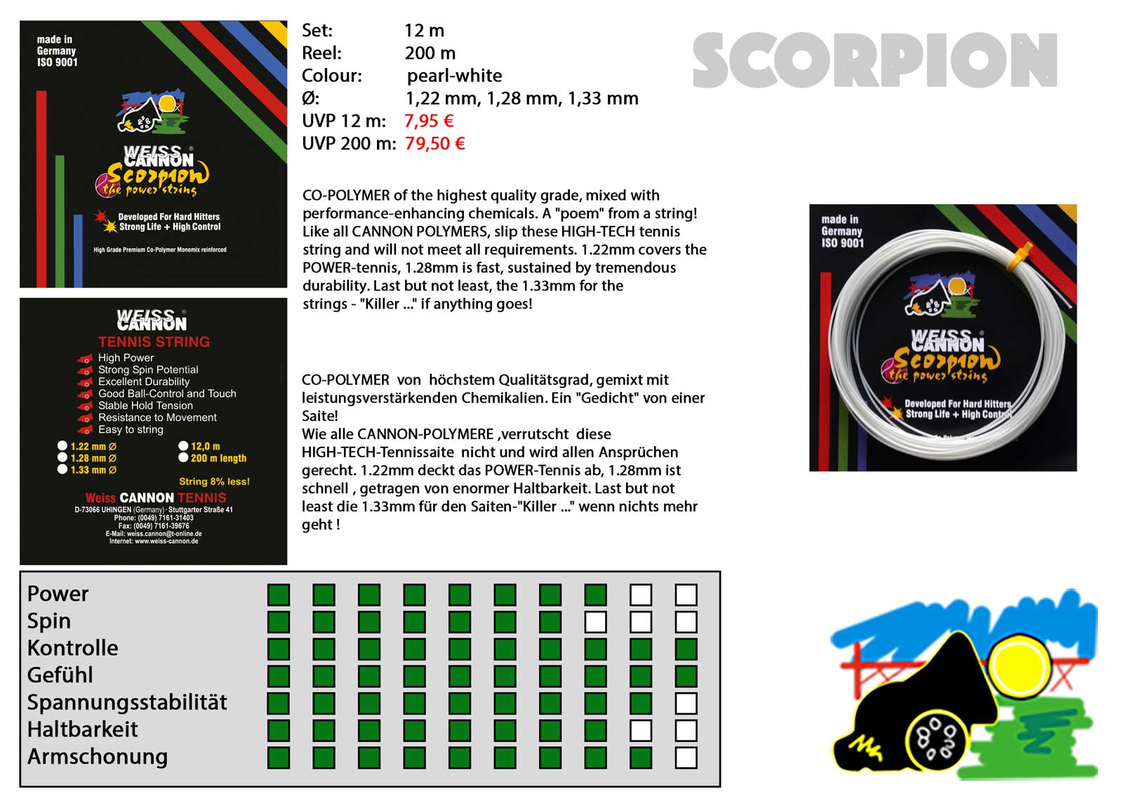 Visoko kvaliteten Co-polymer, dodan in ojačan z izbranimi kemikalijami. Struna Weiss Cannon Scorpion je izredno hitro pridobila naziv „A dream to play”.